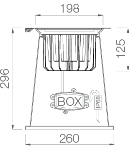 Corpo e tubo camisa em alumínio, acabamento em pintura eletrostática poliéster microtexturizada. Aro de fechamento em alumínio ou opcional em INOX escovado. Óptica em Policarbonato metalizado, difusor em vidro cristal temperado. Vedações em silicone.