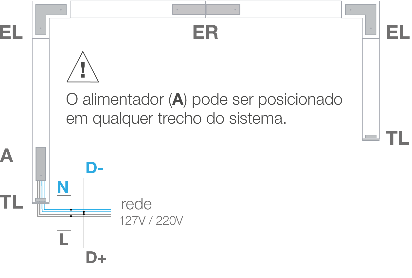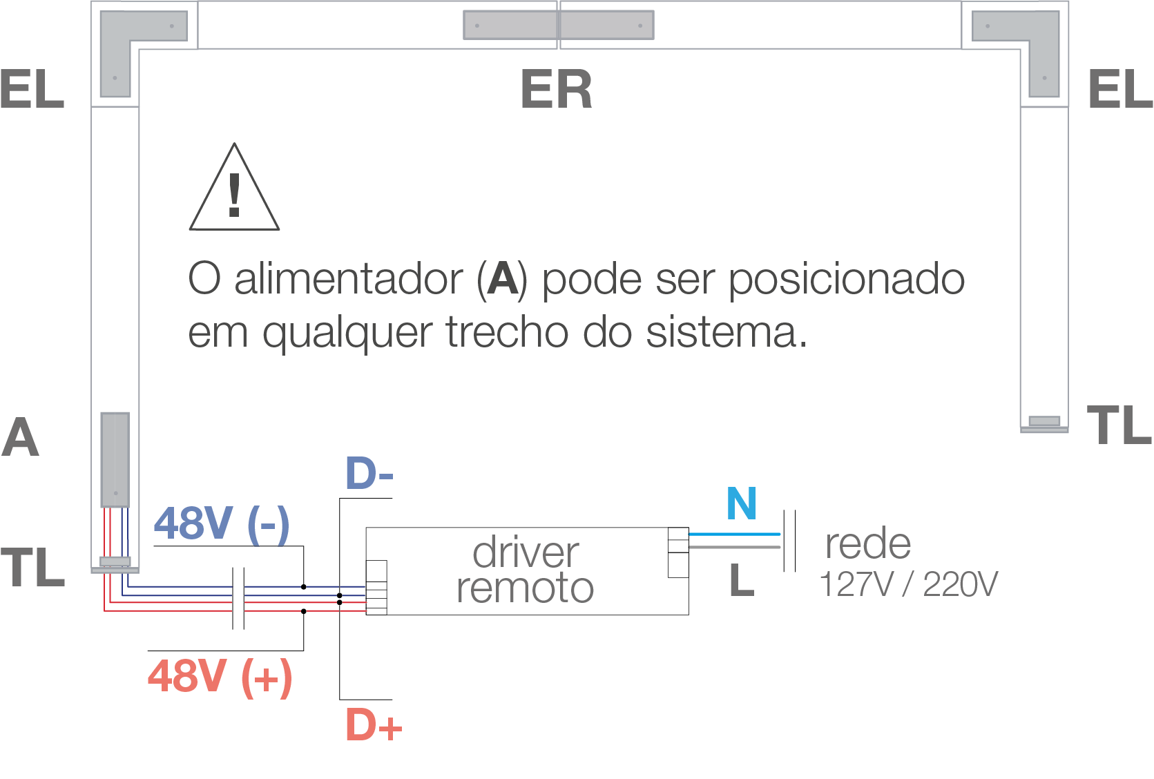 Para alimentação elétrica do sistema de trilho para baixa tensão é necessário o uso do driver remoto fornecido conjunto aos demais componentes pela Lightsource.