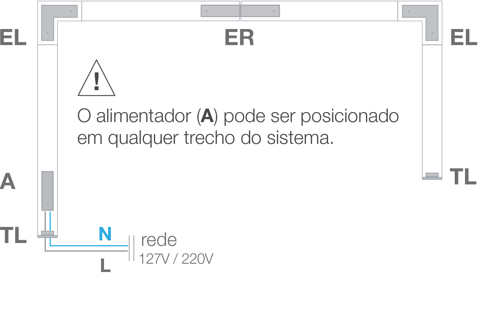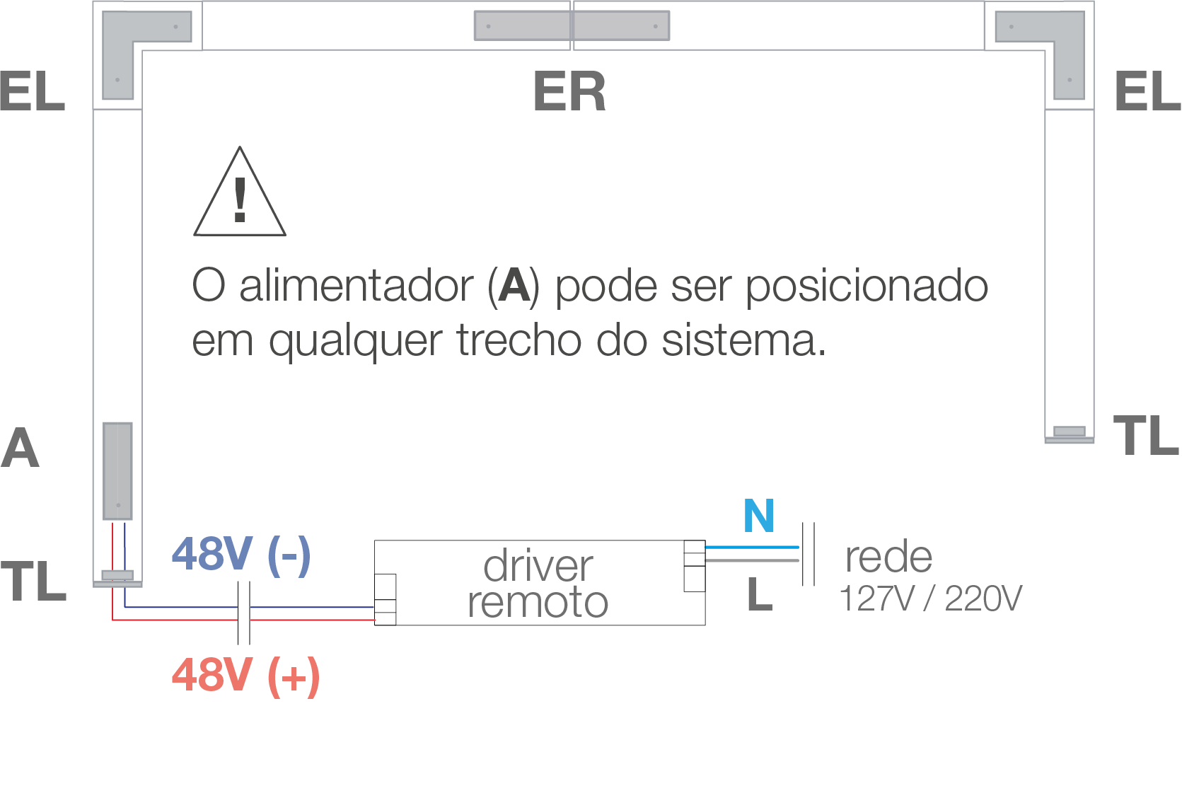 Para alimentação elétrica do sistema de trilho para baixa tensão é necessário o uso do driver remoto fornecido conjunto aos demais componentes pela Lightsource.