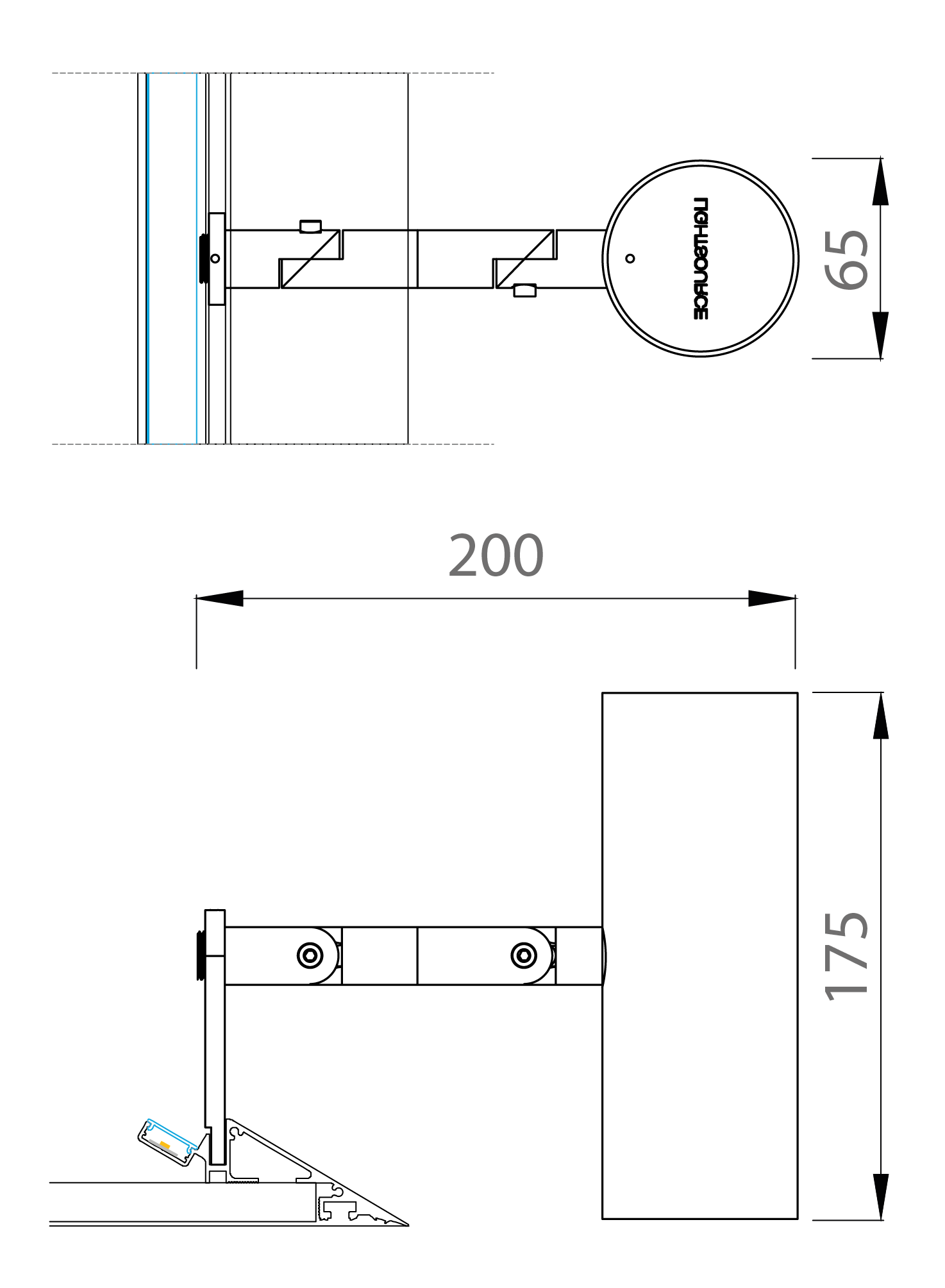 Corpo em alumínio usinado, acabamento em pintura eletrostática poliéster microtexturizado fosco. Óptica em PMMA.