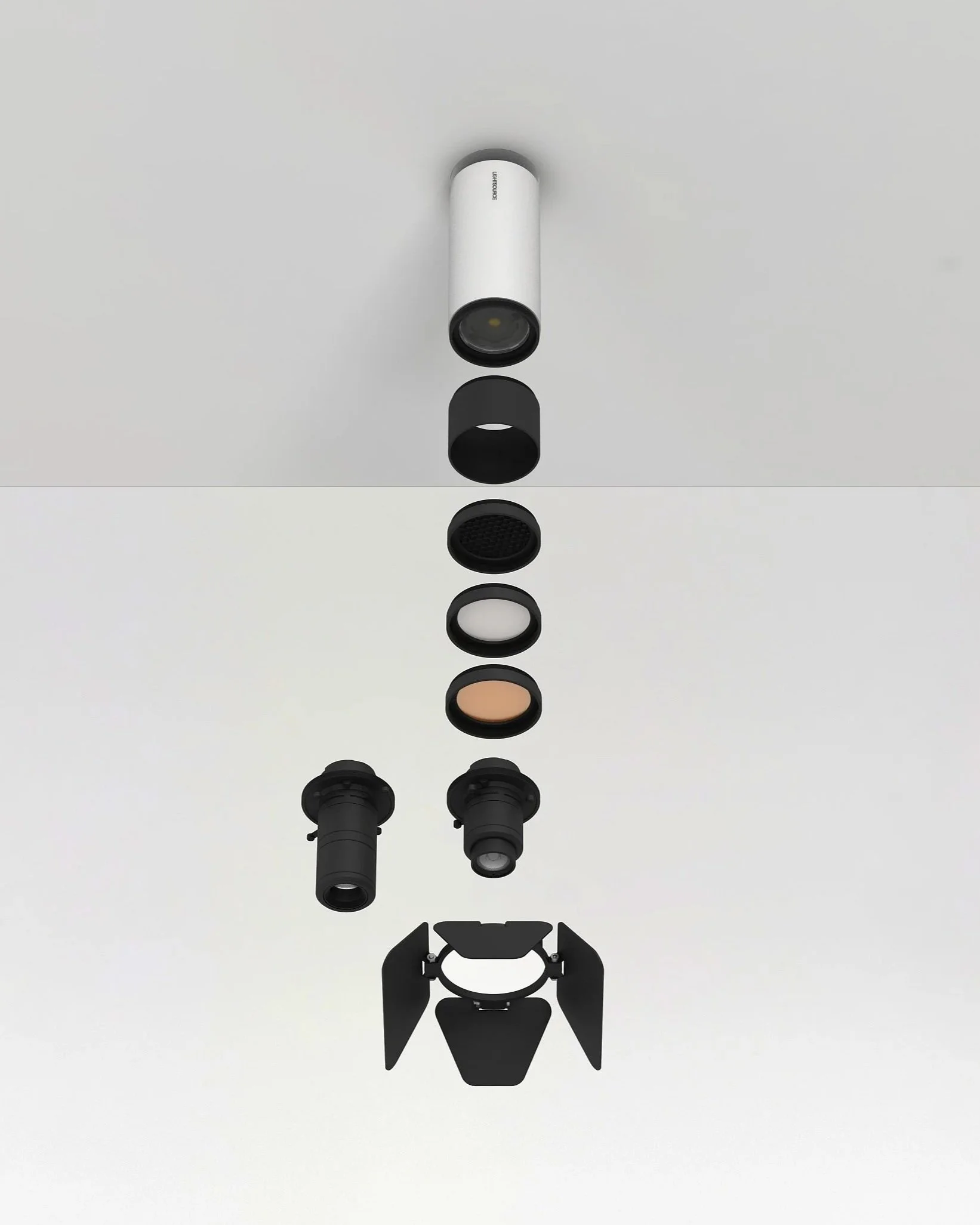 Corpo em alumínio usinado, acabamento em pintura eletrostática poliéster microtexturizado fosco. Óptica em PMMA.