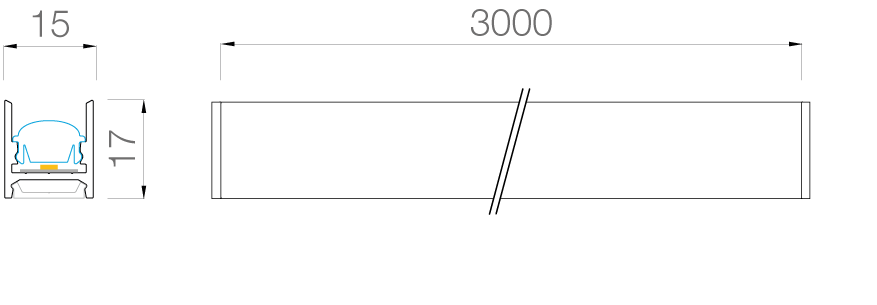 Comprimento do perfil: múltiplo de 50mm, total até 3000mm. Acrescentar 4mm à medida total final com o acréscimo das tampas do perfil.