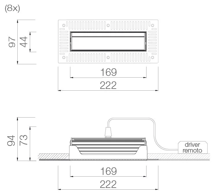 Corpo em alumínio extrudado. Acabamento em pintura eletrostática poliéster fosco. Refletor Bartenbach em policarbonato metalizado.