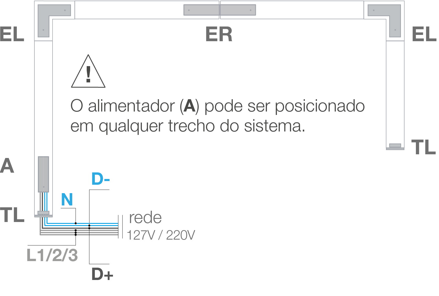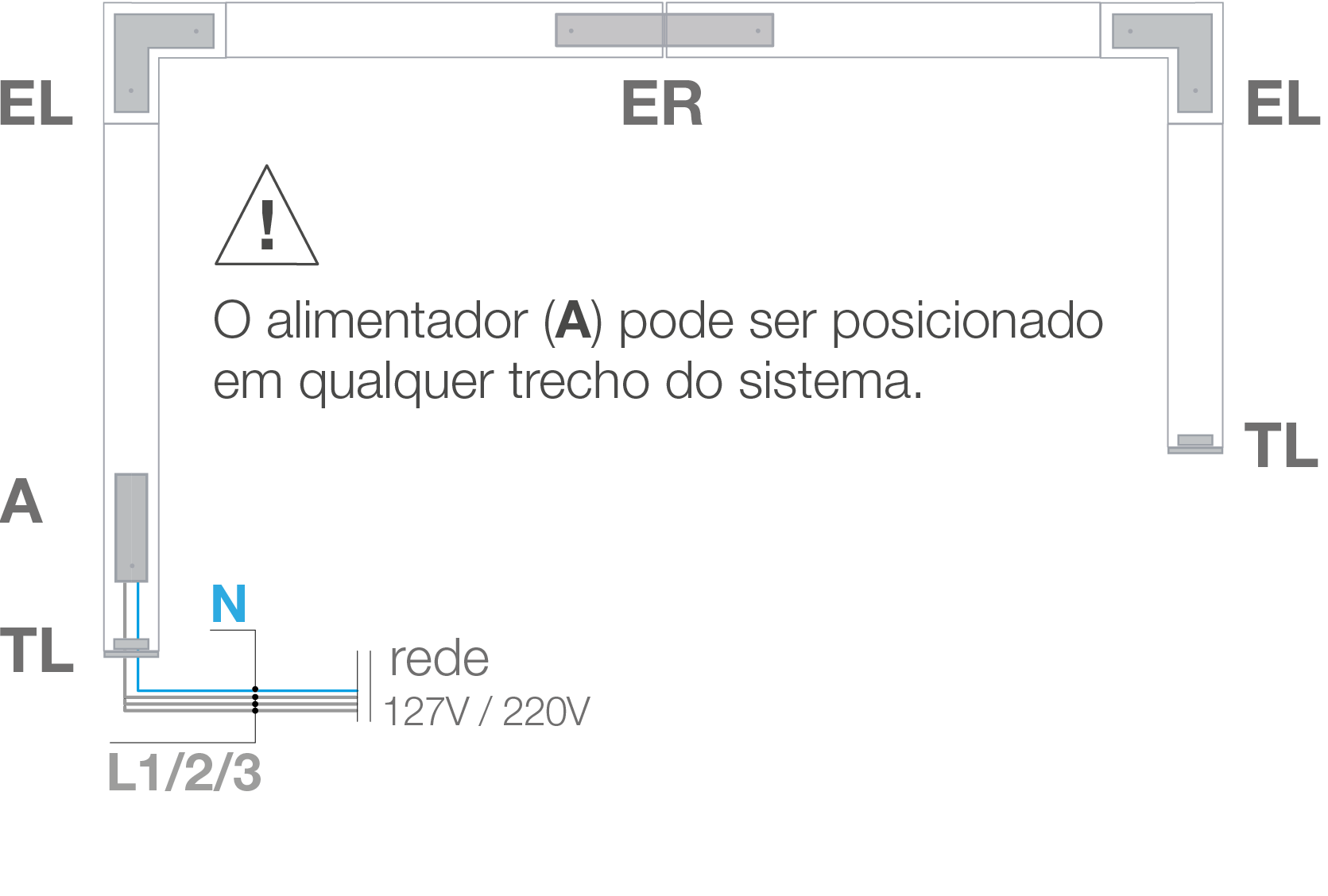 Trilho trifásico de sobrepor ou pendente.
